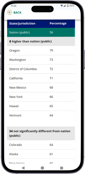 The first two rounds of research and usability testing were helpful, but full of learnings: how to recruit the specialized NAEP audiences, how to navigate the rigid release schedules, and so on. As we did subsequent rounds, we were able to identify ideas that weren’t working in both navigation and visualizations, and ultimately refine our presentations. Some examples are below.
