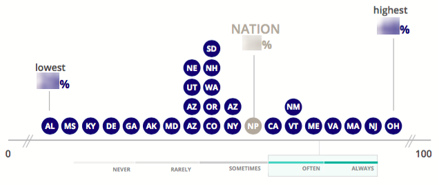 Some months ago, my reintroduction to dot plots took off. In looking at a client’s draft outline, I came to a section describing the range of percentages across states of individuals responding in a certain way to a particular question. The thought was to show a long bar chart of all the states’ percentages, in order. While that would certainly have worked fine, I kept looking at the word “range.” It would be nice, I thought, to better see the distribution of values in one view. That suggested a histogram. There were just fifty-two values, though, and the range was not too wide - could they all fit with bins of one? Before long, I had sketched a pretty straight-up dot plot, which became the mock-up below (the data is not real and not all states are on it, but you can see the idea).